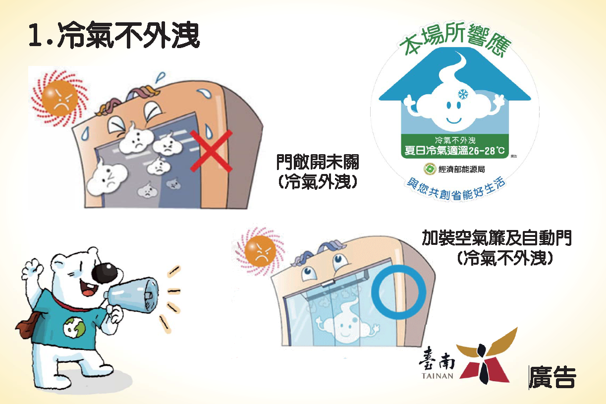 臺南市政府為配合國家能源政策,解決屢創新高的夏季用電量,啟動夏月節電活動,將加強訪視20類服務業場所,執行「1. 冷氣不外洩、2. 禁用白熾燈泡及鹵素燈、3. 室內冷氣溫度不得低於26℃」等節約能源規定相關措施宣導。另一方面增加獎勵誘因,引導民眾改變用電行為,民眾可在8月17日前登錄台電網站參加夏季節電獎勵金活動,住宅用電每度折扣0.8元。