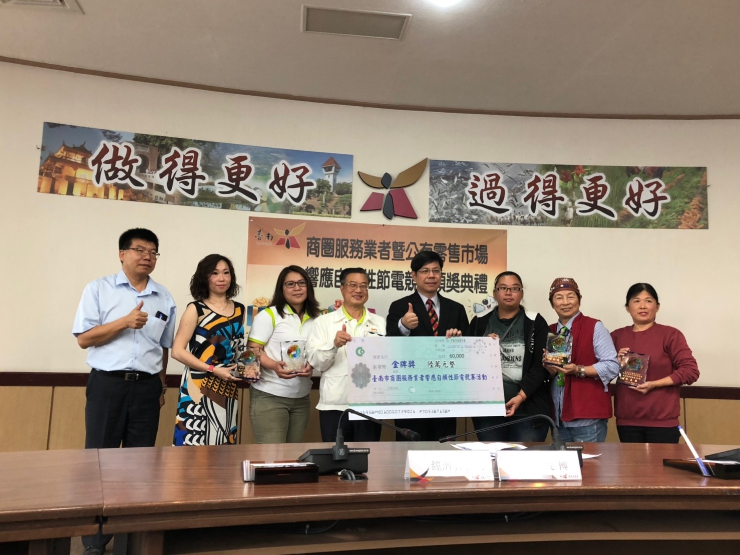 臺南市政府為建立服務業自主響應節約能源之形象,及落實低碳城市之目標,去(107)年特辦理「臺南市商圈服務業者暨公有零售市場響應自願性節電獎勵競賽辦法」,共有60間商圈店家及55處公有零售市場參與競賽,總節電度數高達7萬6,587度,成效卓越,於今(25)日在民治市政中心舉辦競賽頒獎。本次競賽分為商圈組及市場組進行競賽,商圈組共有